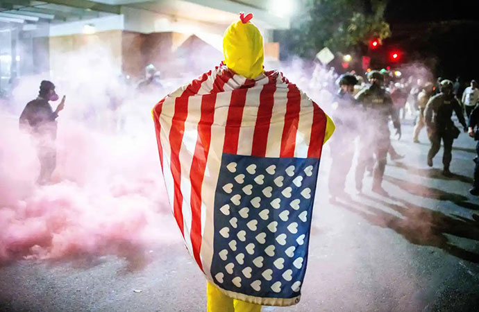 A protester, draped in an altered ‘American flag, watches as law enforcement officers try to disperse protesters near a U.S. Immigration and Customs Enforcement facility in Portland, Ore. on Sunday, Oct. 5, 2025. Photo: AP/UNB