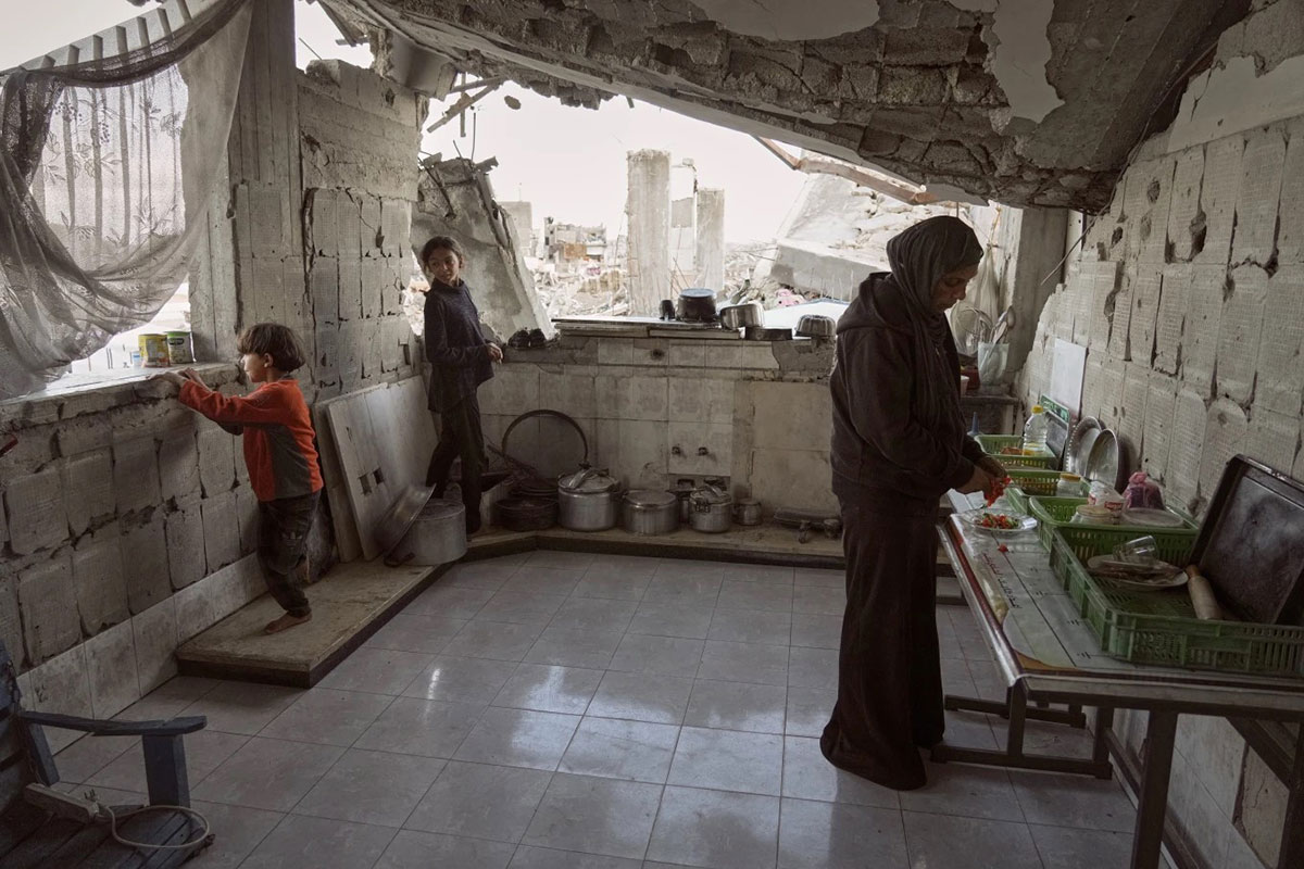 Amani Halawa prepares food beneath the half-collapsed roof of her home, with her children Aya, 13, and Bashir, 10, by her side as they try to carry on daily life amid the rubble, in Jabaliya, Gaza City, Tuesday, Nov. 25, 2025. Photo: AP/UNB