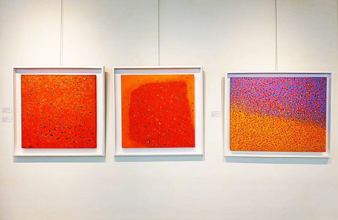 It is evident that Nipa has now engaged herself with vibrant colours to highlight the internal expressions of intangible structures. Her colours and textures distinctly convey a sense of peace and harmony. She aims to create a psychological narrative. She intends to produce artworks that not only depict our physical appearance but also encapsulate our mental, emotional, and spiritual conditions. The artist appreciates her choice of materials, which are seemingly well-balanced and technically impressive.
