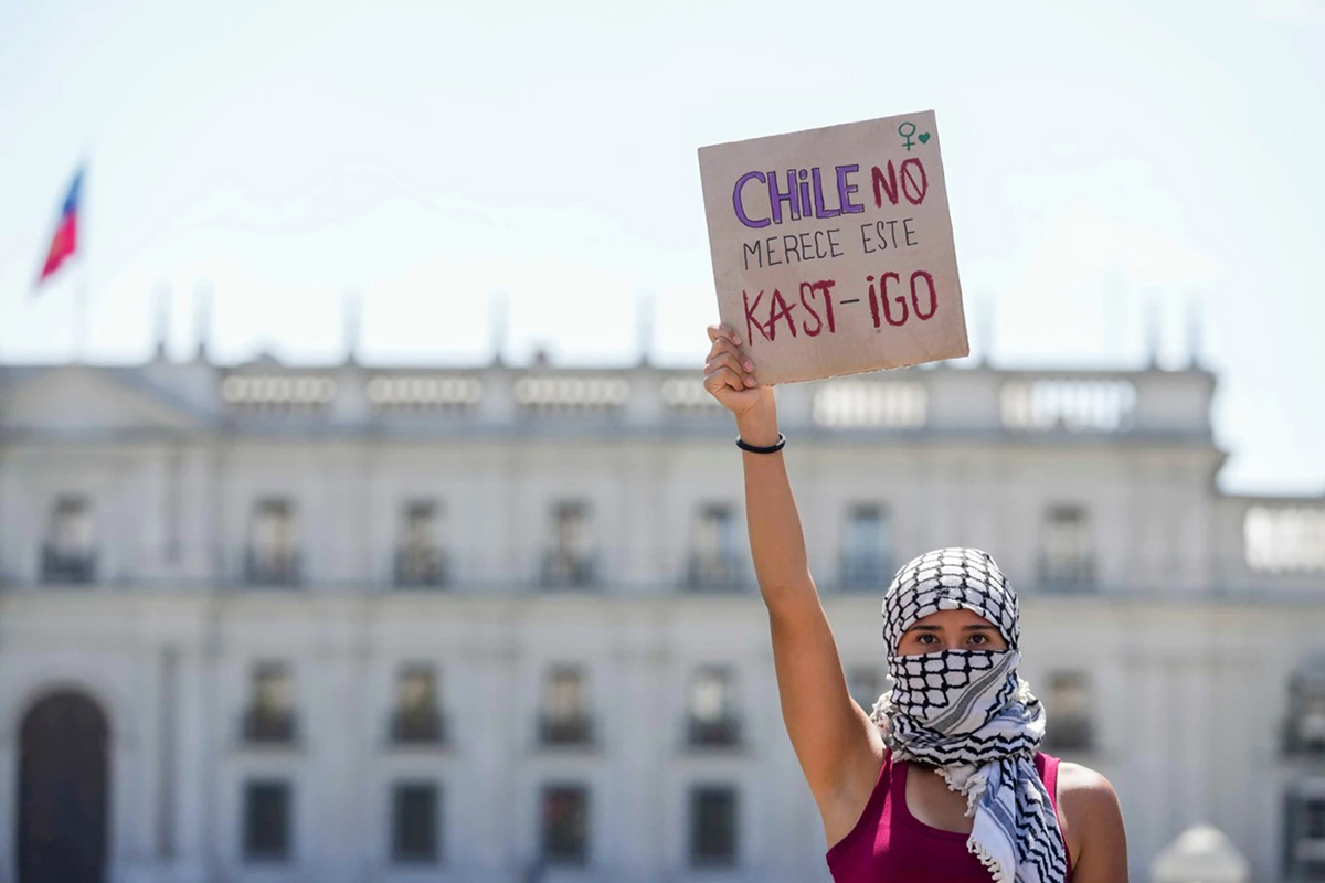 A woman holds a banner that reads in Spanish, “Chile does not deserve this punishment,” a pun in reference to Chile’s President-elect Jose Antonio Kast, during an International Women’s Day protest in Santiago, Chile, Sunday, March 8, 2026. Photo: AP/UNB